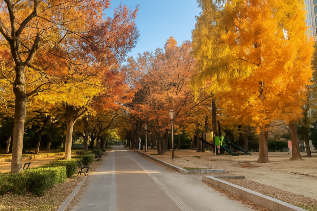 窓から見える靱公園のイチョウがとても綺麗でした。