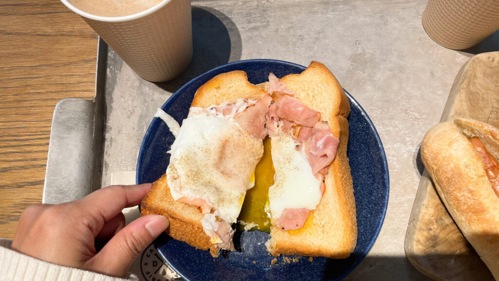 目玉焼きベーコントーストは黒こしょうがしっかり効いていて、パンはふんわり。
